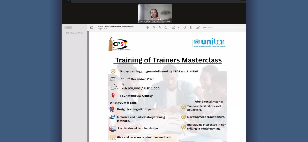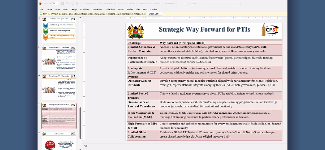 El pasado 6 de octubre de 2025, se celebró el seminario “Parliamentary Training Institutes (PTIs) – Strategic Way Forward”, organizado por la Unión Interparlamentaria (IPU) y el Centro para Estudios y Formación Parlamentaria (CPST) del Parlamento de Kenia.