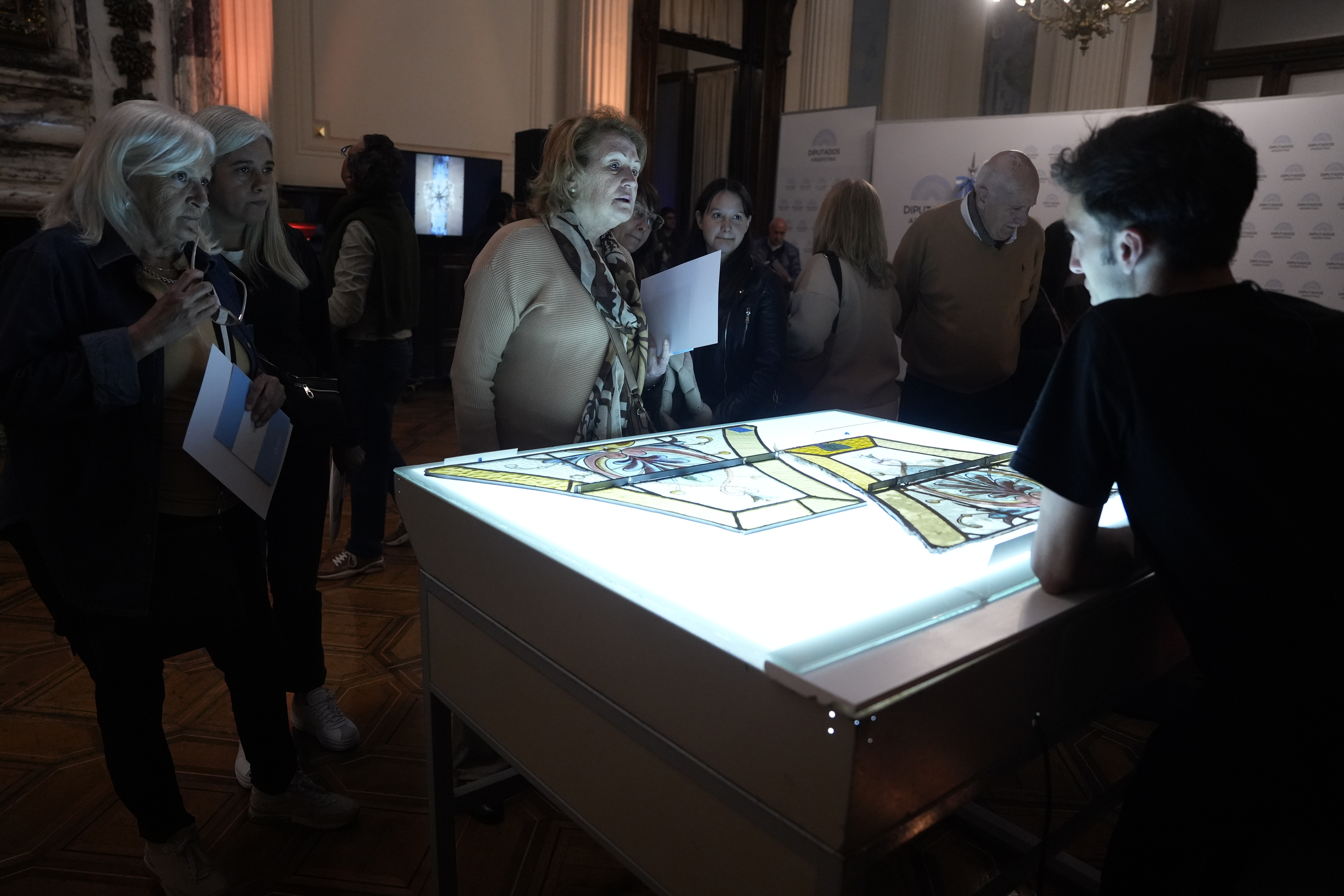 Por su parte, el Salón Delia Parodi permitió apreciar la labor de los talleres de vitrales y madera a través de dispositivos visuales. En el Salón de los Pasos Perdidos se instalaron diez pantallas organizadas por temática y distribuidas a lo largo del espacio, con el objetivo de ofrecer una experiencia atractiva y dinámica.