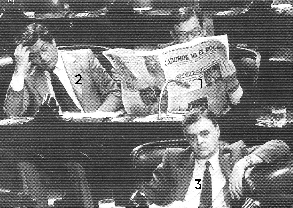 El diputado Conrado Hugo Storani* lee el diario con el título “¿Adónde va el dólar?”. A su lado, Balbino Pedro Zubiri** y en primer plano José Bielicki***.