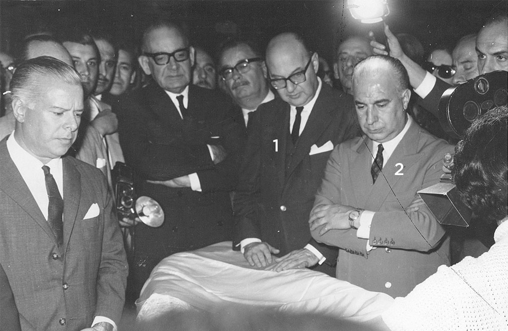 Despedida del diputado de la Nación Alfredo Lorenzo Palacios*, fallecido el 20 de abril de 1965. Sus restos fueron recibidos en el Salón Azul del Congreso de la Nación por el vicepresidente de la Nación, Carlos H. Perette, y el presidente de la H. Cámara de Diputados, Arturo Mor Roig**.