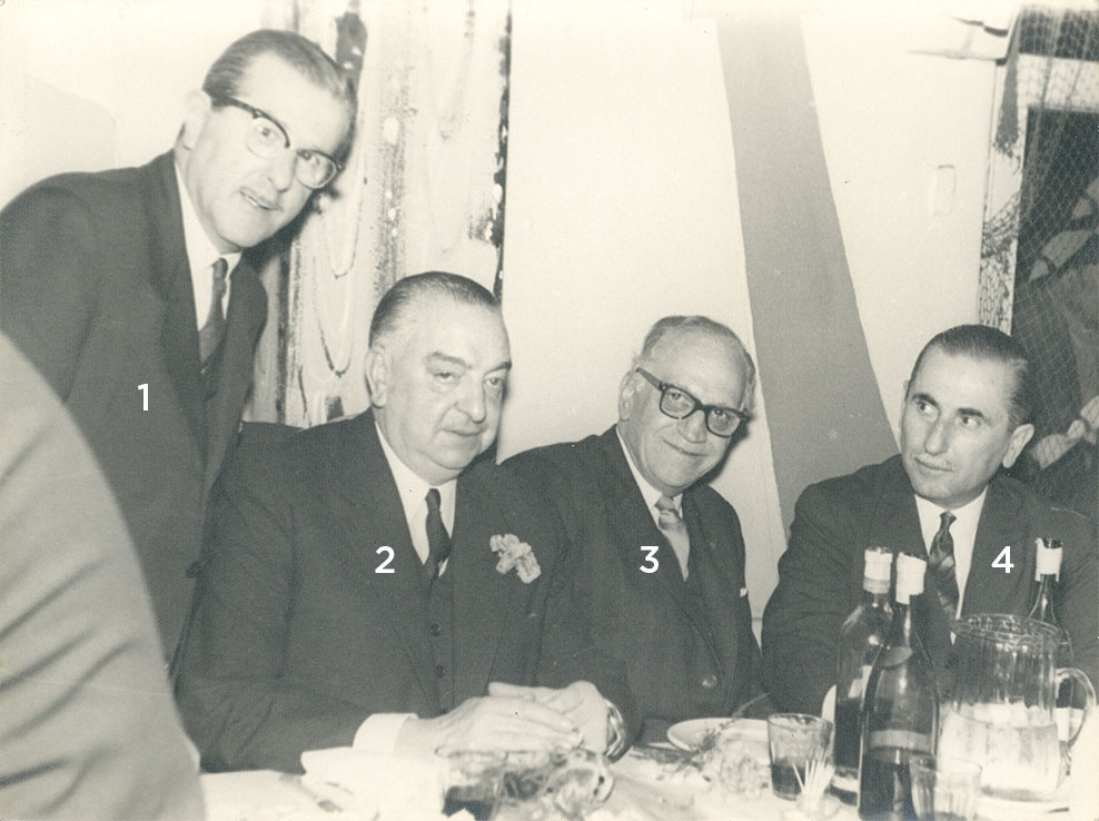 Cena de camaradería compartida por los diputados de la Nación Francisco Monteagudo*, entonces Secretario General de la vicepresidencia de la Nación; Reinaldo Elena**; y Anselmo Antonio Marini***, en ese momento gobernador de la Provincia de Buenos Aires, junto al Relator Administrativo de la H. Cámara de Diputados, Obdulio Espósito.