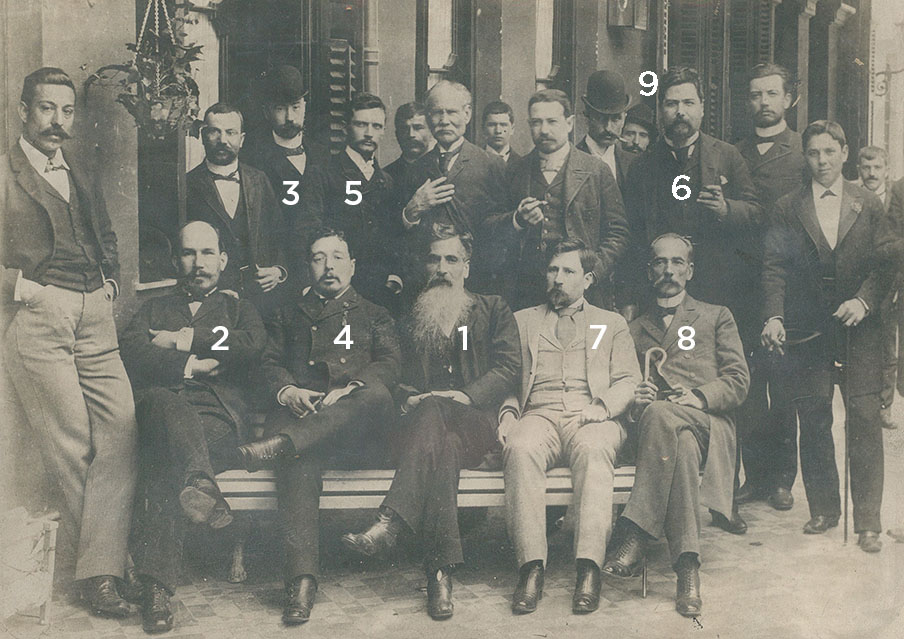 El presidente del Comité Nacional de la Unión Cívica Radical, Leandro N. Alem (1), junto a Delfor del Valle (2), Guillermo Leguizamón (3), Francisco A. Barroetaveña (4), Juan José Posse (5) y Martín Demetrio Yrigoyen (6)—quienes serían diputados de la Nación en años posteriores—; Joaquín Lejarza, Mariano Candioti y Pedro Carlos Molina, entre otros. Rosario, noviembre de 1891.